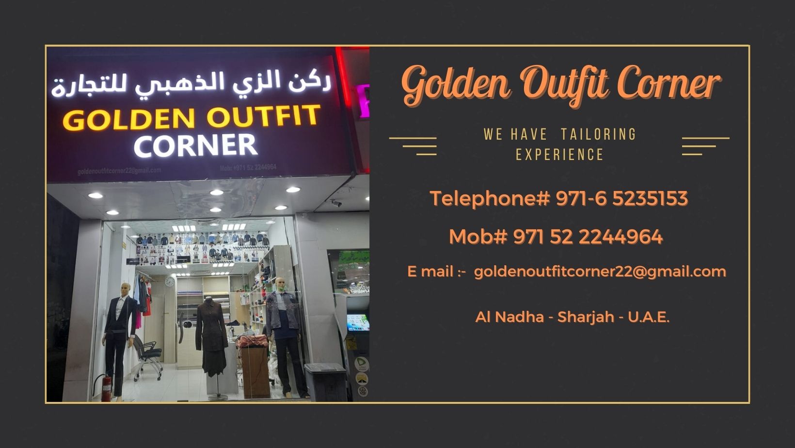 Our Vision at Golden Outfit Corner is to be the leading destination for fashion-forward individuals who seek high-quality clothing and accessories. We believe in providing exceptional customer services and offering a curated selection of the latest styles and trends. Our goal is to empower our customers to express their personal sense of style and make a positive impact on the world through sustainable and ethical fashion choices.